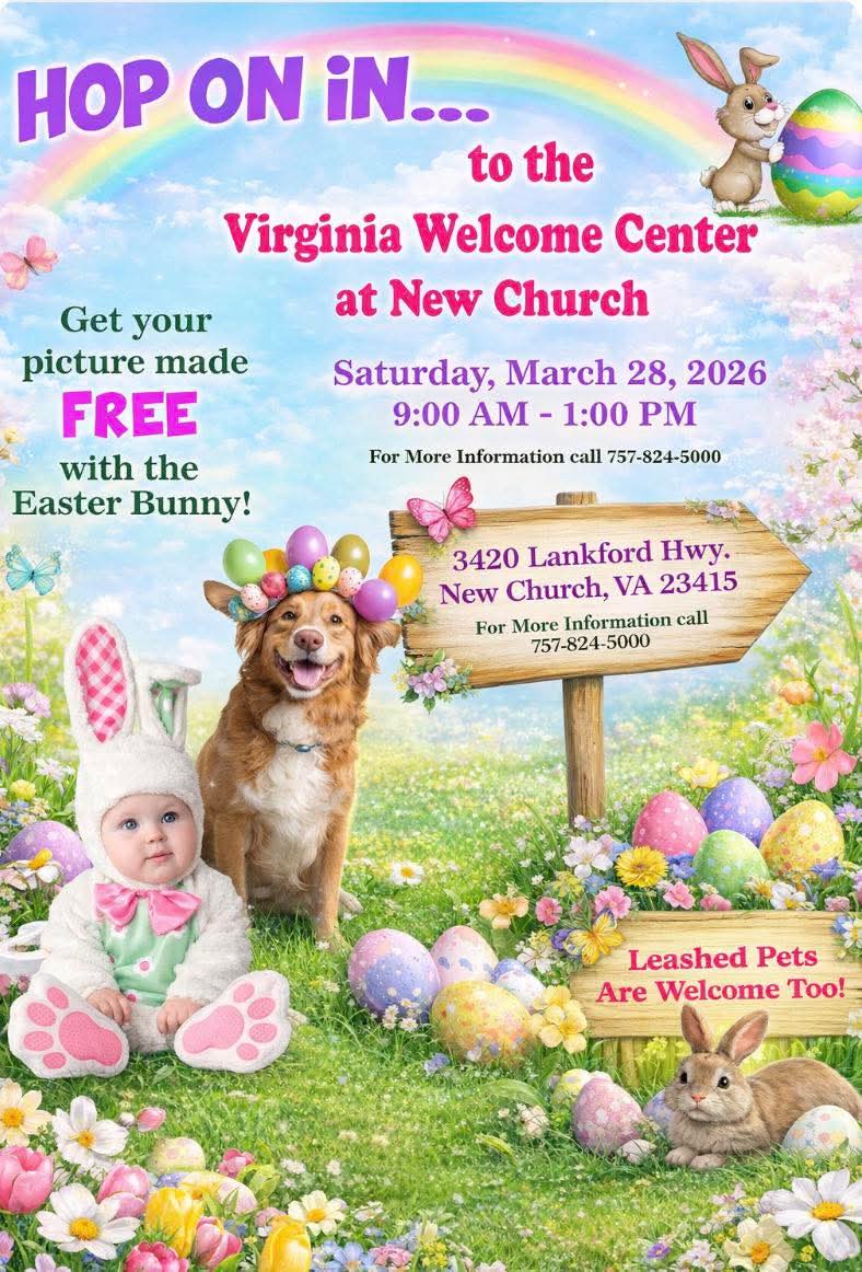 HOP ON IN… to the Virginia Welcome Center at New Church Get your picture made FREE with the Easter Bunny! Saturday, March 28, 2026 9:00 AM – 1:00 PM For More Information call 757-824-5000 3420 Lankford Hwy. New Church, VA 23415 For More Information call 757-824-5000 Leashed Pets Are Welcome Too!