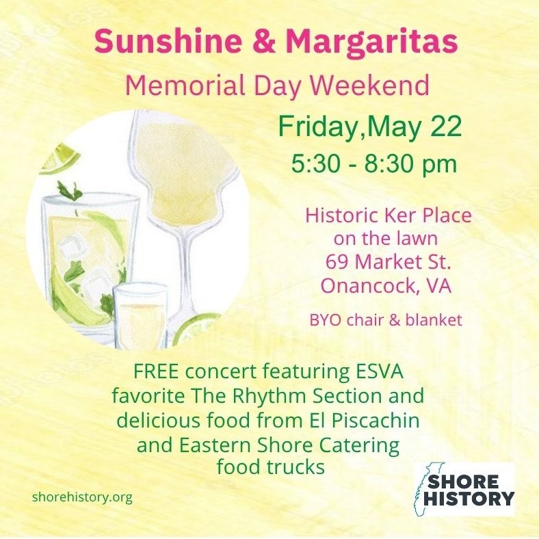 Sunshine & Margaritas Memorial Day Weekend Friday, May 22 5:30 - 8:30 pm Historic Ker Place on the lawn 69 Market St. Onancock, VA BYO chair & blanket FREE concert featuring ESVA favorite The Rhythm Section and delicious food from El Piscachin and Eastern Shore Catering food trucks